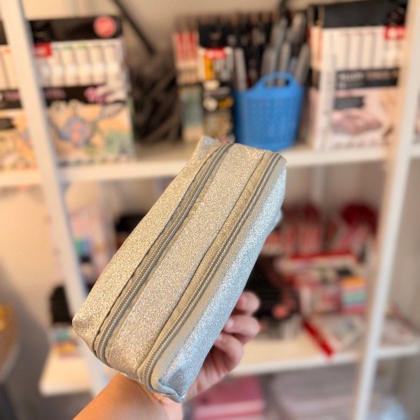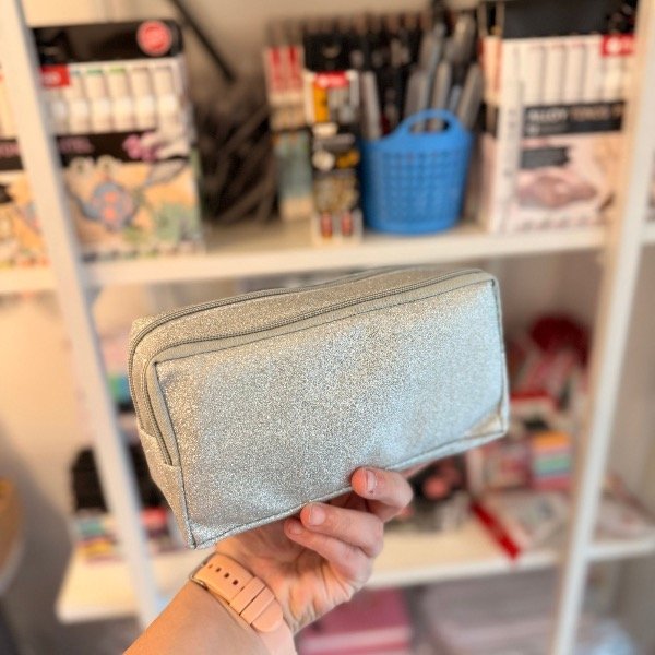 Cartuchera cofre glitter plateado con 2 cierres